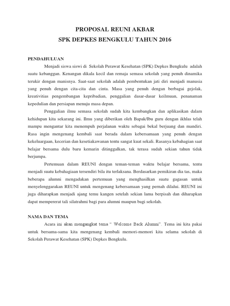 Anak sekolah seperti pelajar, mahasiswa, bahkan orang tua yang berprofesi di dunia bisnis atau di perusahaan pasti. Demikian proposal ini kami sampaikan sebagai bahan pertimbangan agar dapat terlaksananya kegiatan reuni sma sosial budaya. Konsep acara reuni akbar konsep acara reuni disusun oleh : Contoh proposal reuni akbar sma negeri 39. Proposal kegiatan reuni smp reuni smp negeri 1 karangmoncol.